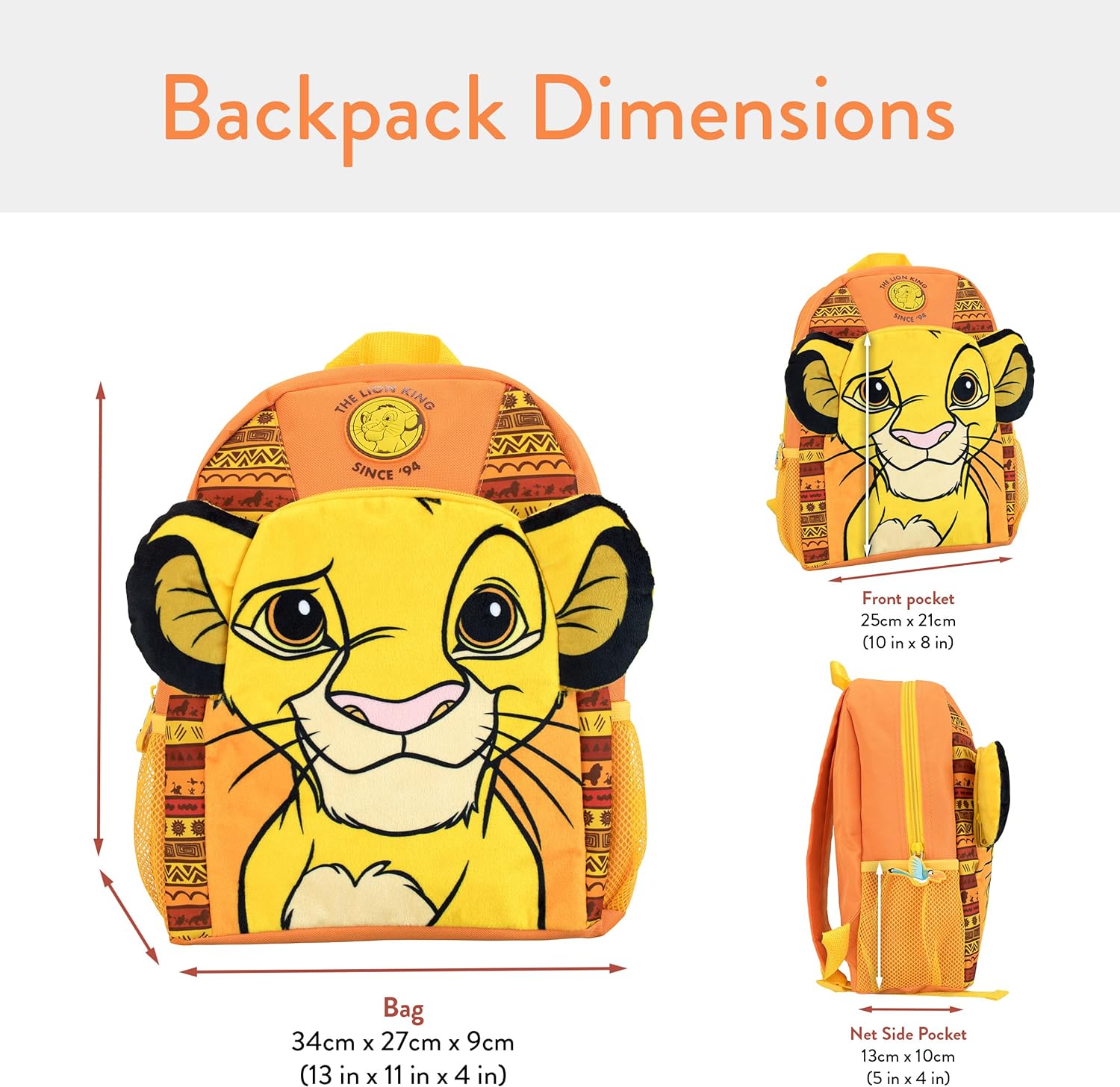 - In shades of orange and yellow, this vibrant bag features Simba on the front pocket in a fuzzy textured fabric with 3D plush ears! The main bag features a striped background with African print detailing and a rubberised logo of Simba with ‘The Lion King Since ’94’.